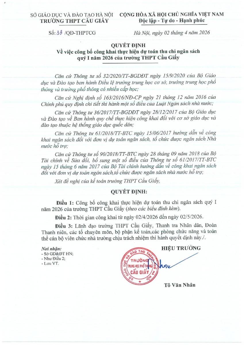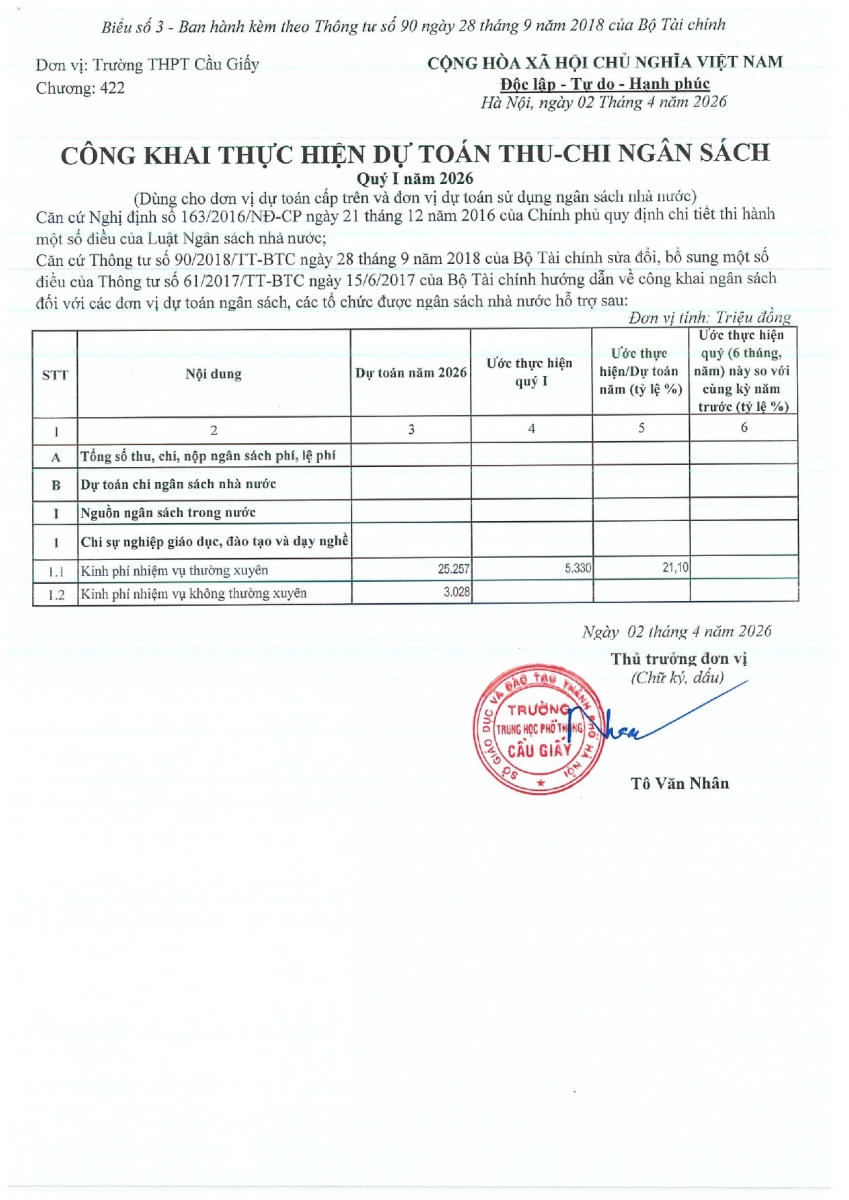CÔNG KHAI THỰC HIỆN THU CHI NGÂN SÁCH QUÝ I NĂM 2026