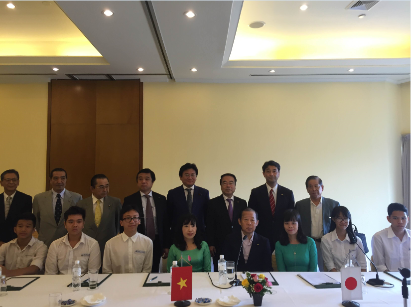 Cô Lê Thị Hồng - Hiệu trưởng nhà trường cùng HS gặp mặt ngài Nikai- Tổng thư kí đảng dân chủ Nhật Bản nhân ngày sóng thần thế giới |