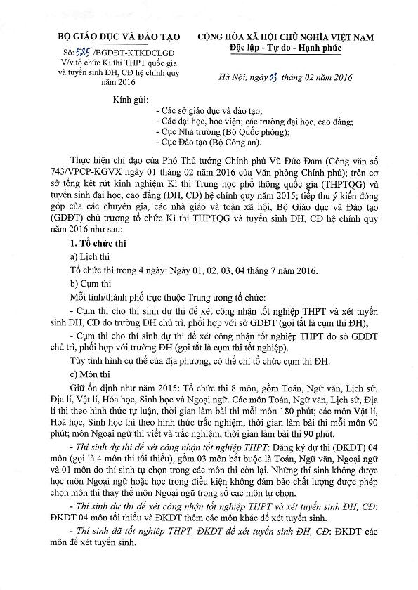 THÔNG TIN VỀ KỲ THI THPT QUỐC GIA NĂM 2016